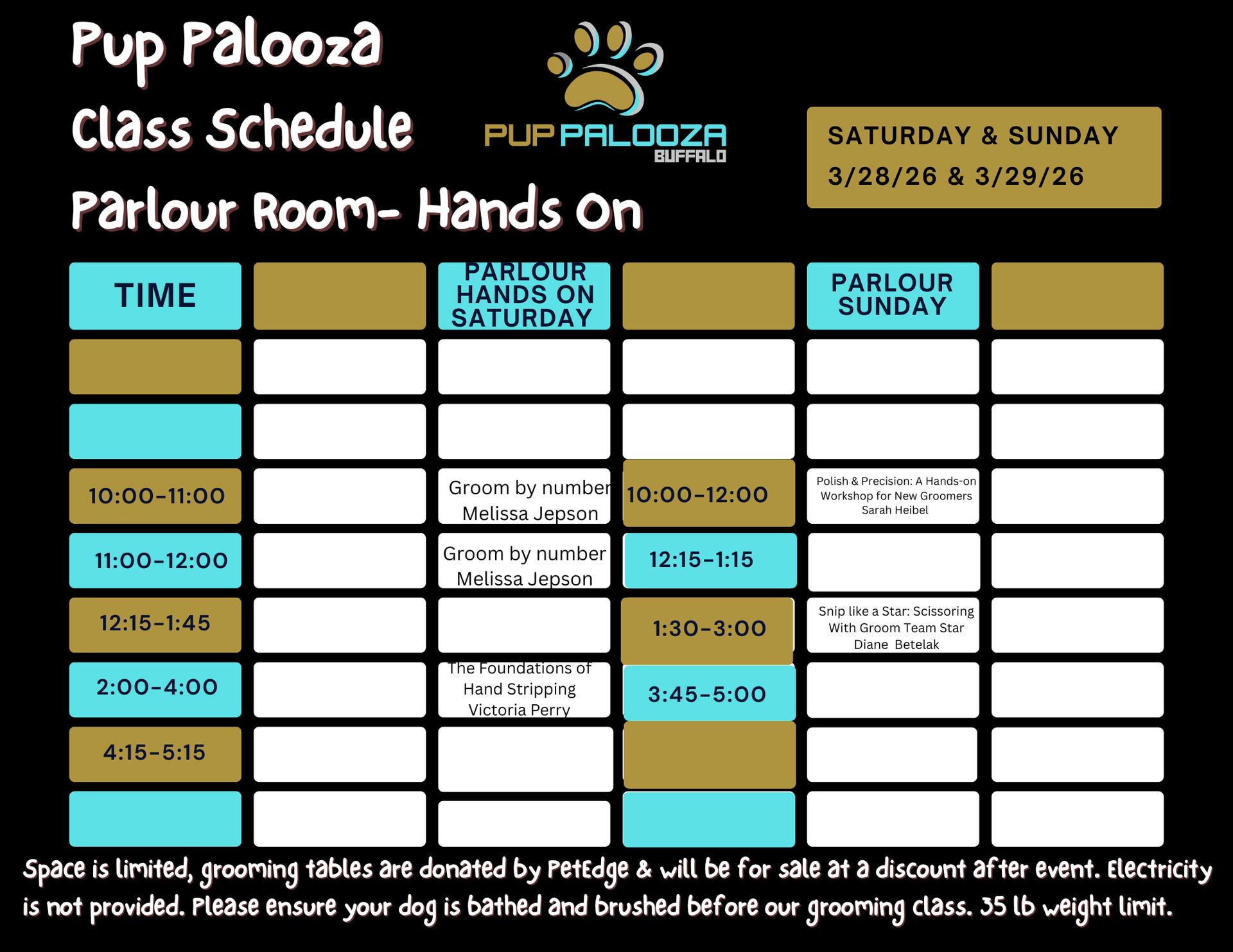 Space is limited, PetEdge will be providing grooming tables. Electricity is not provided. You are to bring a bathed, blow dried, prepped well behaved and trained dog to work on in classroom. Weight limit 35lbs. Please bring proof of up-to-date shot records. Please bring grooming loop, brush, thinners, straights, curves, chunkers & any other scissors/ tools you would like to possibly discuss. Please continue to check back on this page as more information comes in for more specific needs from the instructors and follow social media for updates. * Free standing grooming tables will be available for sale after show for $80.00, marked down from $189.00!* To reserve contact James at PetEdge or find at the show!