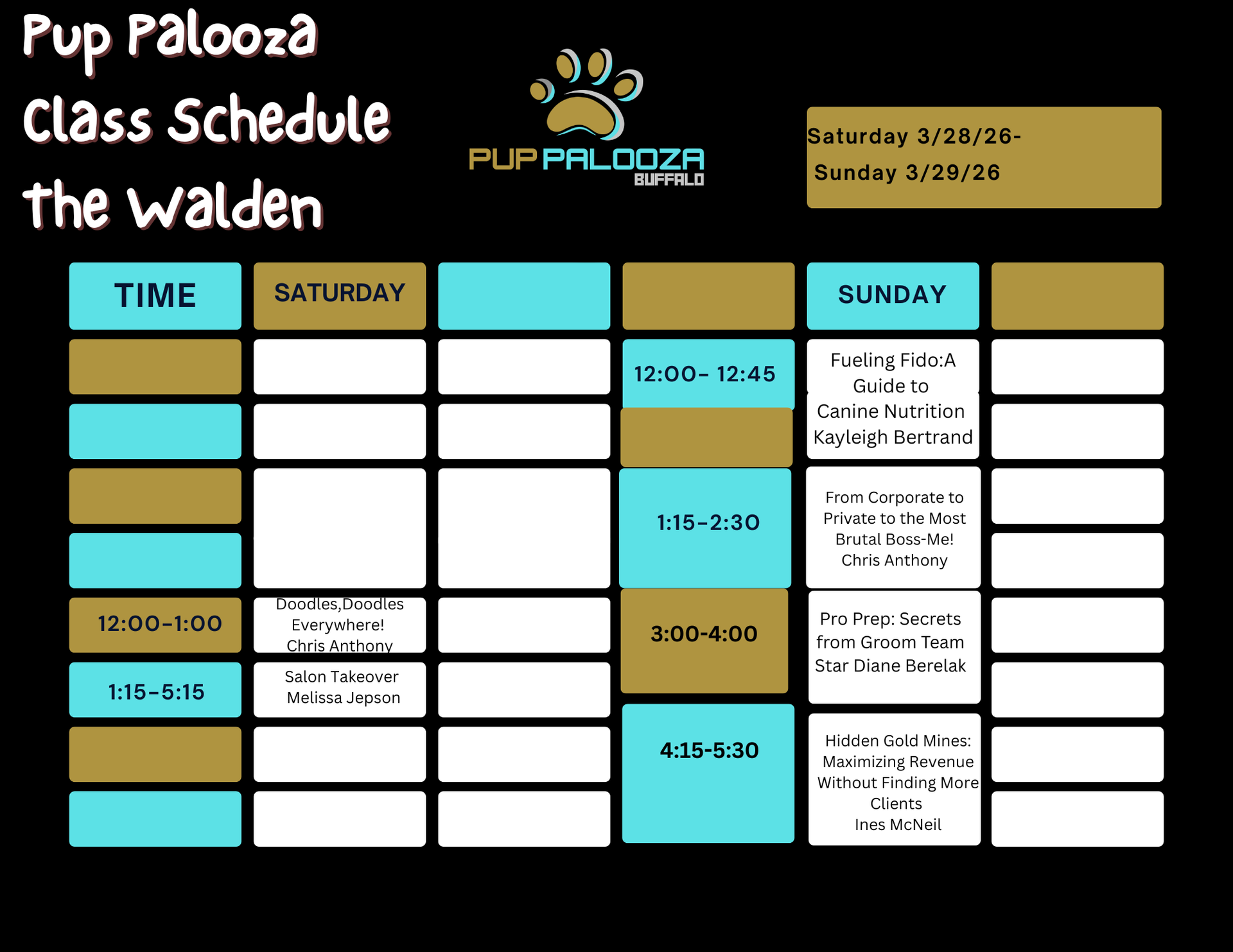 Only demo, competition, and hand- on class dogs are allowed. No personal pets permitted.